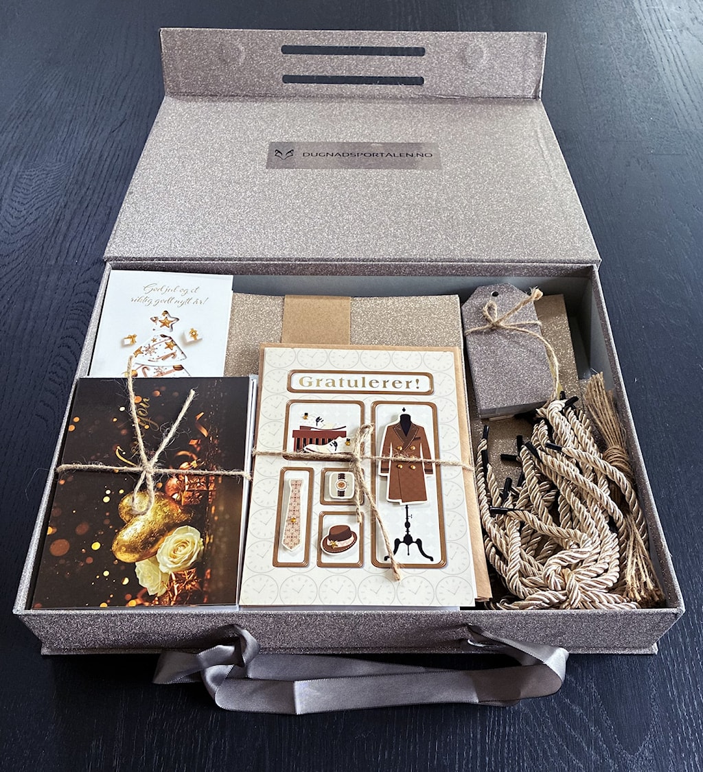 Innhold: 3 stk. Gaveposer str. M • 2 stk. Gaveposer str. L • 1 stk. Gavepose med julemotiv str. L • 1 stk. Gavepose for flaske • 3 stk. Håndlagde doble gavekort m/konvolutt • 15 stk. Enkle gavekort m/15 konvolutter • 2 stk. Doble kort med julemotiv • 40 stk. Gavelapper med tråd.