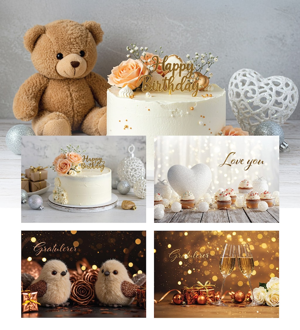 Kortpakken inneholder: 7 stk. Universale gratulasjonskort • 5 stk. Bursdagskort alle aldre • 2 stk. Bursdagskort barn • 2 stk. Bursdagskort/konfirmasjon ungdom • 4 stk. Valentineskort/spesielle anledninger • 20 stk. Konvolutter tilpasset kortene.